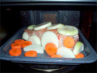 にタマネギを厚切りして並べ、にんじんも厚めに切って周りに置きまし