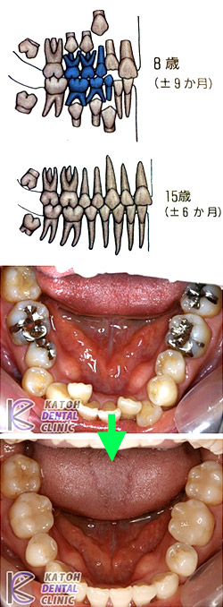 ムーシールドが開発される前は「永久歯が生えてきてからやりましょう」と言っていました。「早期治療」といわれる段階が6歳臼歯と前歯8本生えたあたりからスタートします。年齢では6歳から10歳ぐらいでしょうか。この期間の治療目的は顎の骨の成長をコントロールすることです。 早期治療に使う装置はいろいろとありますが、いずれも歯が並ぶスペースを作り出すことを目的とします。費用は40万円(ムーシールドを使った人は30万)です 。